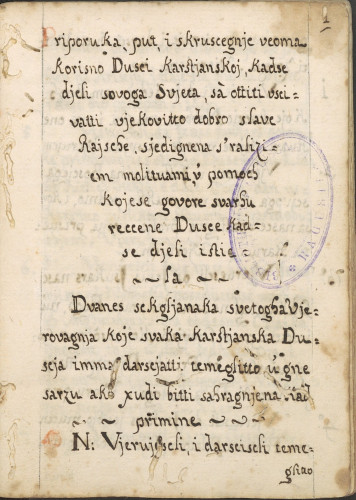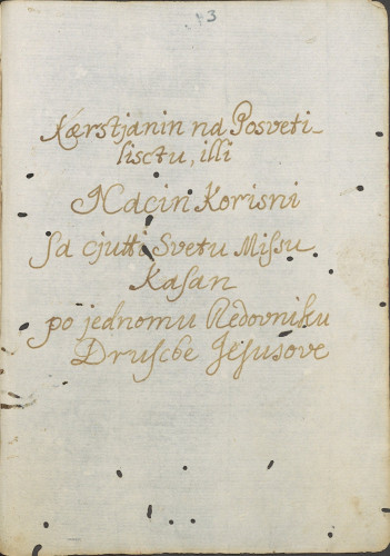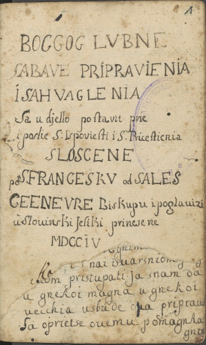Boggoglubne Sabave Pripravienia i sahvaglenia/ Sa u djello postavit prie / i poslie S. Ispoviesti i S. Pricestienia / Sloscene / po S. Francesku od Sales / Geenevre Biskupu i poglauizi / ù Slouinski Jesiki prinesene / MDCCIV /
